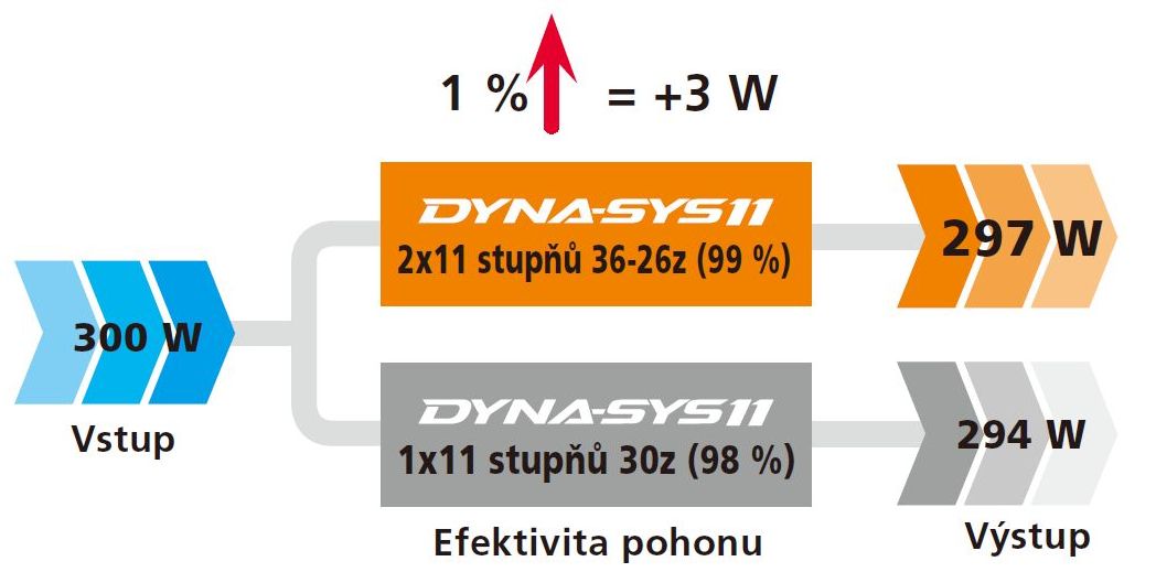 - Lepší složení převodů a účinnost přenosu energie - menší křížení řetězu, efektivní přírůstky převodového poměru