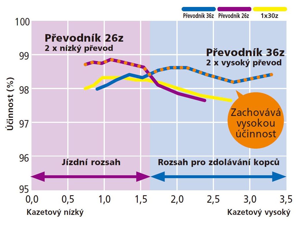 - Vícepřevodníková přední část pohonu (2x, 3x) přináší vyšší účinnost v celém rozsahu